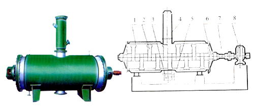 1、殼體   2、耙齒   3、出料裝置   4、加料裝置   5、粉碎棒   6、密封裝置   7、攪拌軸   8  、傳動裝置